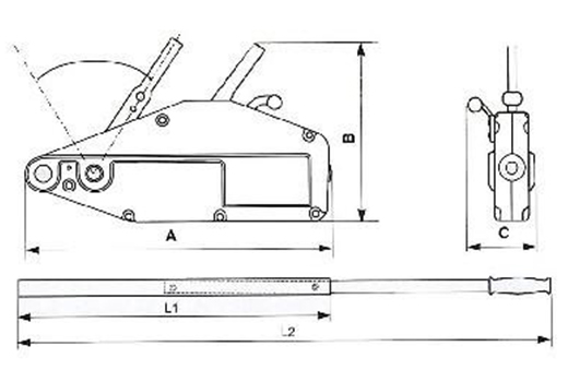 額定起重量(KG) 額定收拉力N 額定前進行程 鋼絲繩直徑(mm) 鋼絲繩安全系數(shù) 整機安全系數(shù) 最大載荷(KG) 整機重量(KG) 整機尺寸 L1(mm) L2(mm)