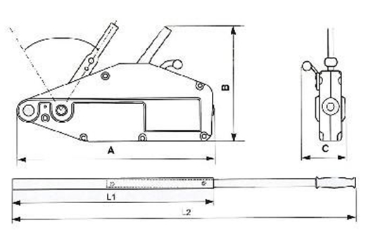 型號(hào) | 額定載荷 | 額定載荷時(shí)手拉力 | 額定載荷時(shí)手柄往復(fù)一次鋼絲繩行程 | 鋼絲繩直徑 | 葫蘆重量 | 外形尺寸 |